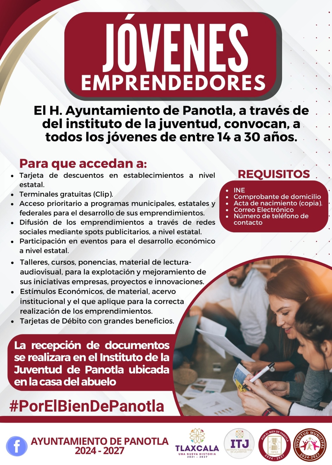 Con la finalidad de promover el autoempleo en jóvenes tlaxcaltecas de 14 a 30 años de edad, el Instituto de la Juventud de Panotla en conjunto del Instituto Tlaxcalteca de la Juventud (ITJ) emitió la convocatoria “Jóvenes Emprendedores”, buscando brindar beneficios que el gobierno municipal, estatal y federal tiene para ellos.