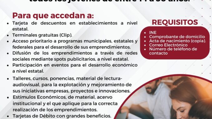 Se dará apoyo a jóvenes emprendedores los cuales recibirán diversos beneficios como tarjetas de descuento a nivel estatal, terminales gratuitas, acceso prioritario a programas, difusión de emprendimiento, participación en eventos, talleres, cursos, estímulos económicos tarjetas de débito con grandes beneficios.