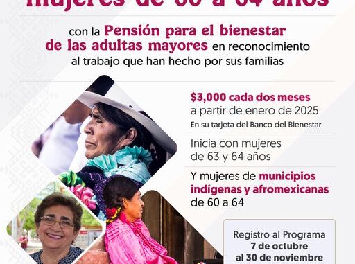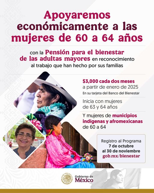 Y de mujeres de municipios indígenas y afromexicanas de 60 a 64 años. El registro será a partir del 7 de octubre al 30 de noviembre.
