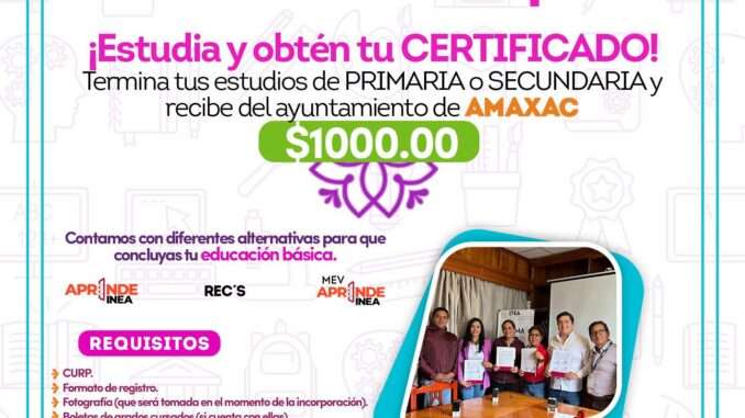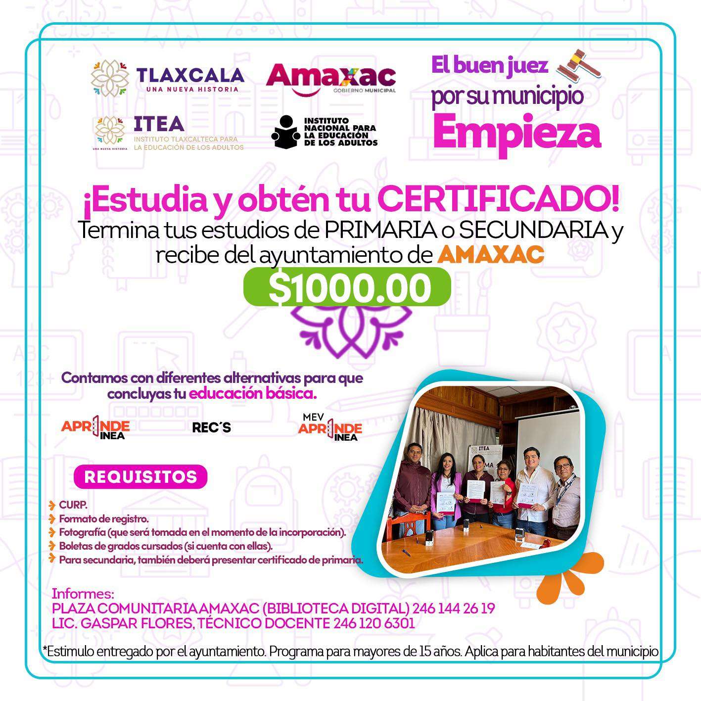 El Gobierno Municipal de Amaxac de Guerrero, que encabeza el alcalde Mauricio Pozos Castañón, en coordinación con el Instituto Tlaxcalteca de Educación para los Adultos (ITEA), invitan a todas las personas mayores de 15 años que no hayan concluido sus estudios de primaria y/o secundaria a concluirlas, es una gran oportunidad para tener su certificado de estudios con validez oficial.