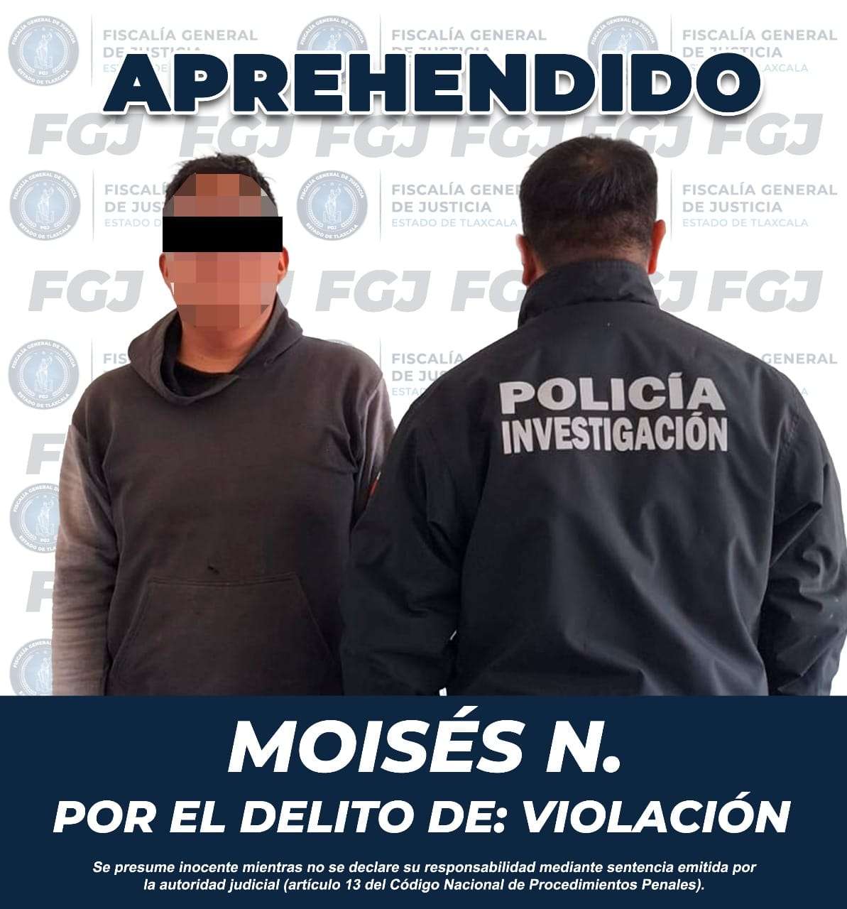 Derivado de los trabajos de inteligencia realizados por la Policía de Investigación, la Fiscalía General de Justicia del Estado (FGJE) aprehendió a Moisés N., por el delito de violación, en agravio de su expareja.