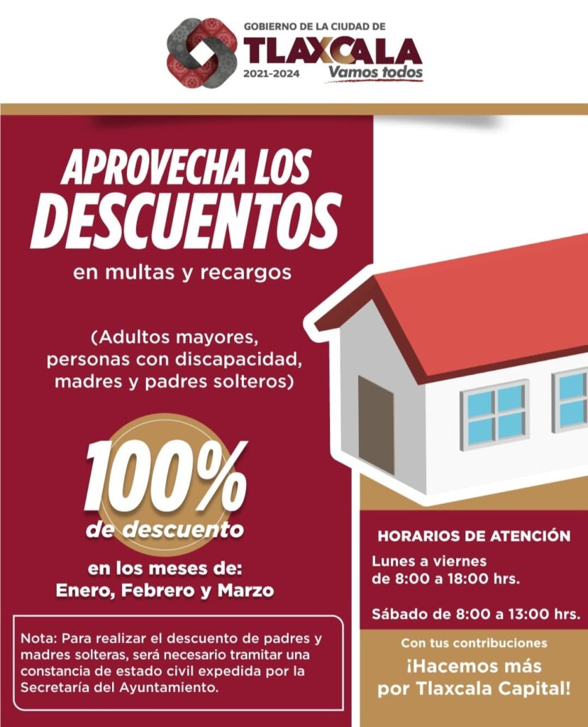 ¡Aprovecha durante enero, febrero y marzo de 2024 la campaña de descuentos en el pago del impuesto predial! enero 4, 2024 Redacción Municipios Para compartir Personas con discapacidad, adultos mayores, madres y padres solteros podrán acceder al 100% de descuento en multas y recargos. Tu contribución se traduce en más obras y servicios.