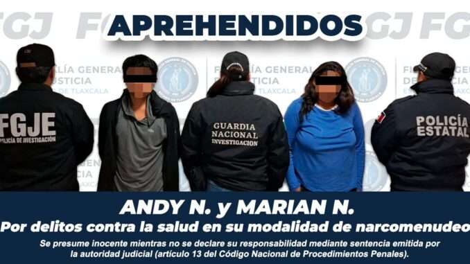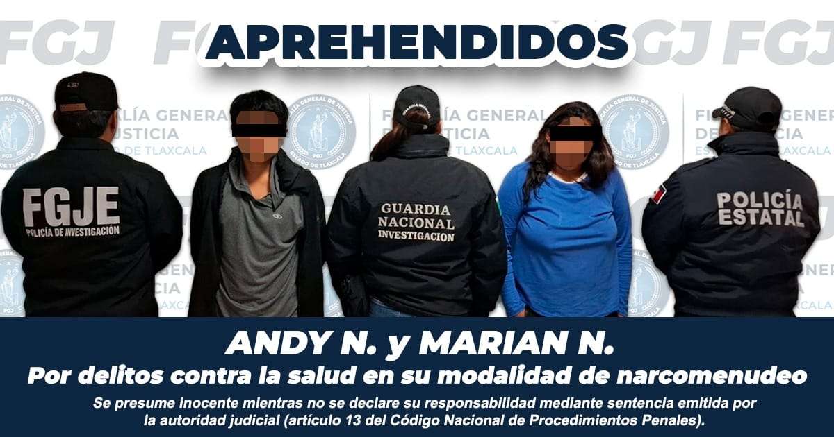 Como parte de las acciones para combatir el delito de narcomenudeo, la Fiscalía General de Justicia del Estado (FGJE) aseguró a Marian N. y Andy Gabriel N., por delitos contra la salud en su modalidad de narcomenudeo, a quienes les aseguraron un paquete con hierba seca de color verde con las características propias de la marihuana, pequeñas bolsas con producto estupefaciente, similar al llamado cristal y un vehículo.