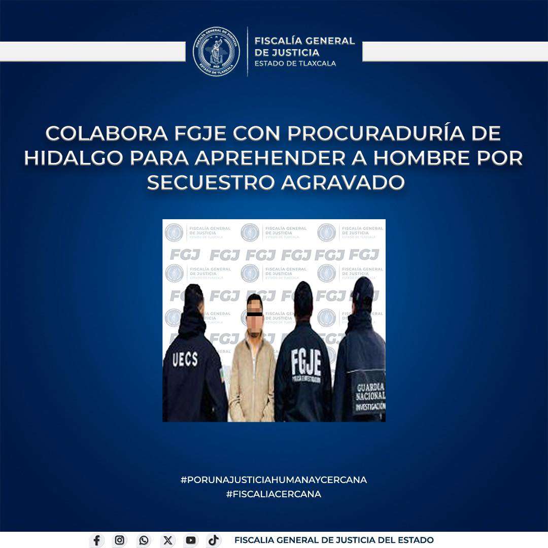La Fiscalía General de Justicia del Estado (FGJE) colaboró con la Procuraduría General de Justicia del Estado de Hidalgo (PGJEH) para aprehender a Juan Carlos N., por su presunta responsabilidad en el delito de secuestro agravado.