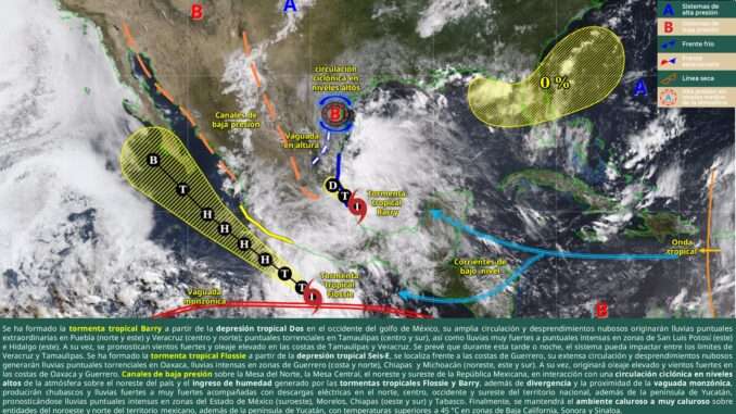 las costas de Michoacán y Colima; la baja presión remanente de Barry sobre el noreste