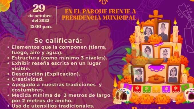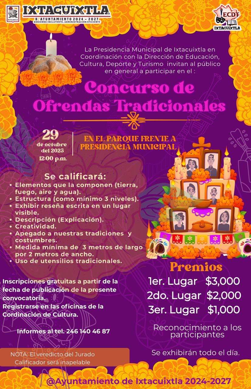 El Ayuntamiento de Ixtacuixtla, en coordinación con el Área de Educación, Cultura, Deporte y Turismo, invita a la ciudadanía en general a participar en las diferentes dinámicas y actividades que se llevarán a cabo con motivo de la celebración del Día de Muertos 2025.