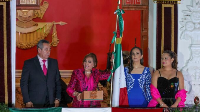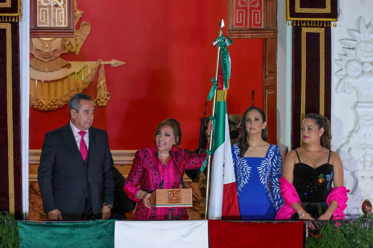Desde el balcón central del Palacio de Gobierno, acompañada por sus hijas Mariana y Fernanda Espinosa de los Monteros Cuéllar, así como de su esposo Salvador Ballesteros Rodríguez, la gobernadora ondeó la Bandera Nacional y recordó a los hombres y mujeres que participaron en el movimiento de Independencia.