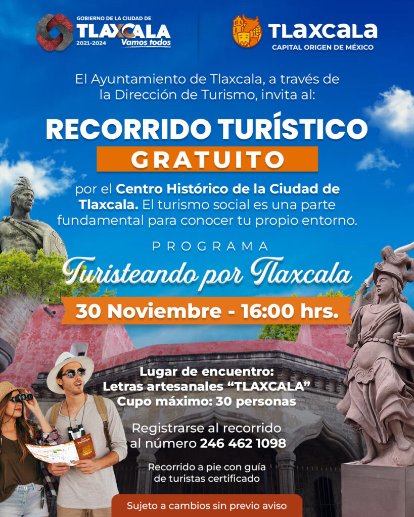 Únete al recorrido turístico gratuito el próximo 30 de noviembre, cortesía de la Dirección de Turismo del Ayuntamiento de Tlaxcala.
