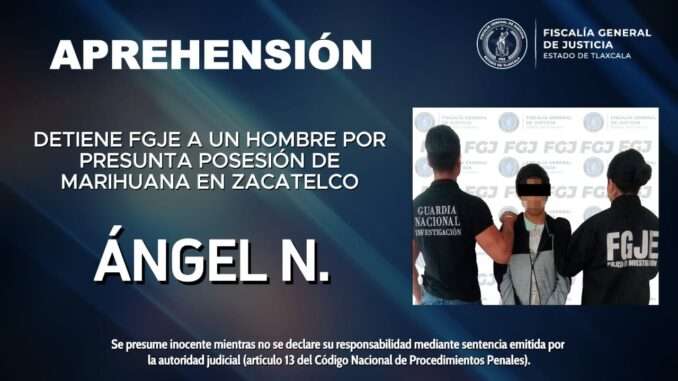 La Fiscalía General de Justicia del Estado (FGJE) detuvo en Zacatelco a Ángel N., en posesión de una bolsa con hierba similar a la marihuana.