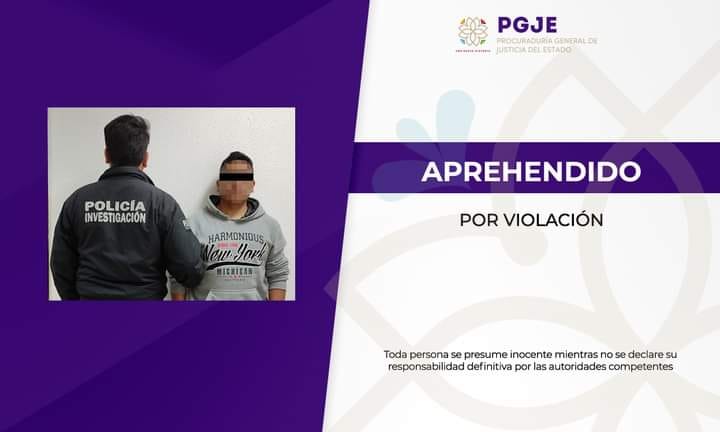 Agentes de la Policía de Investigación de la #PGJE ejecutaron una orden de aprehensión en contra de un masculino por el delito de violación. Los hechos asentados en la carpeta de investigación refieren que, el ahora imputado agredió sexualmente a la víctima, además de amenazarla de muerte si contaba lo ocurrido; sin embargo, decidió decirle a su mamá y presentaron la denuncia correspondiente.