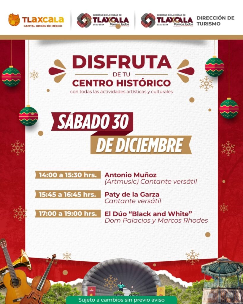 El 2023 se termina y en Tlaxcala Capital, te esperamos con las actividades artísticas y Culturales y disfrutes del Centro Histórico, donde además tenemos el pabellón artesanal que estará tambien colocado el lunes 1 de enero y el mercado de artesanos en la calle Xicohténcatl (atrás de la presidencia municipal y el portal grande)