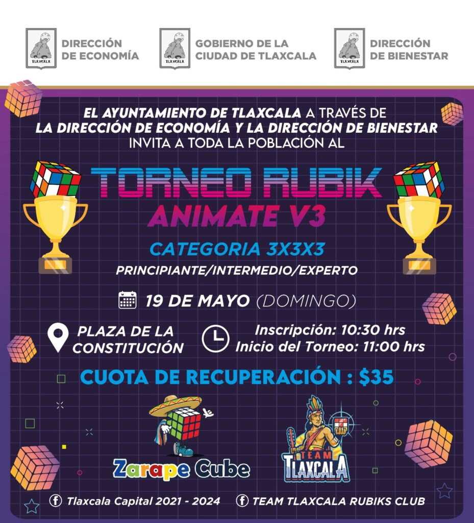 El Ayuntamiento de Tlaxcala invita a toda la población a participar en el «Torneo de Rubik».#TlaxcalaCapital mayo 19, 2024 Redacción Municipios Para compartir