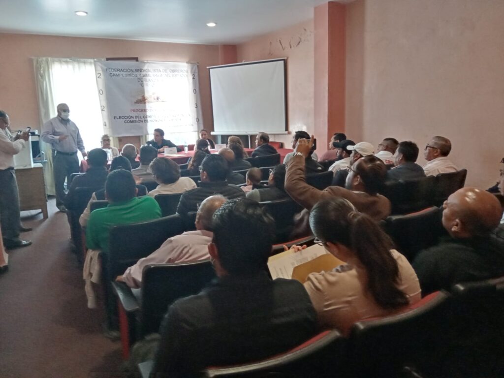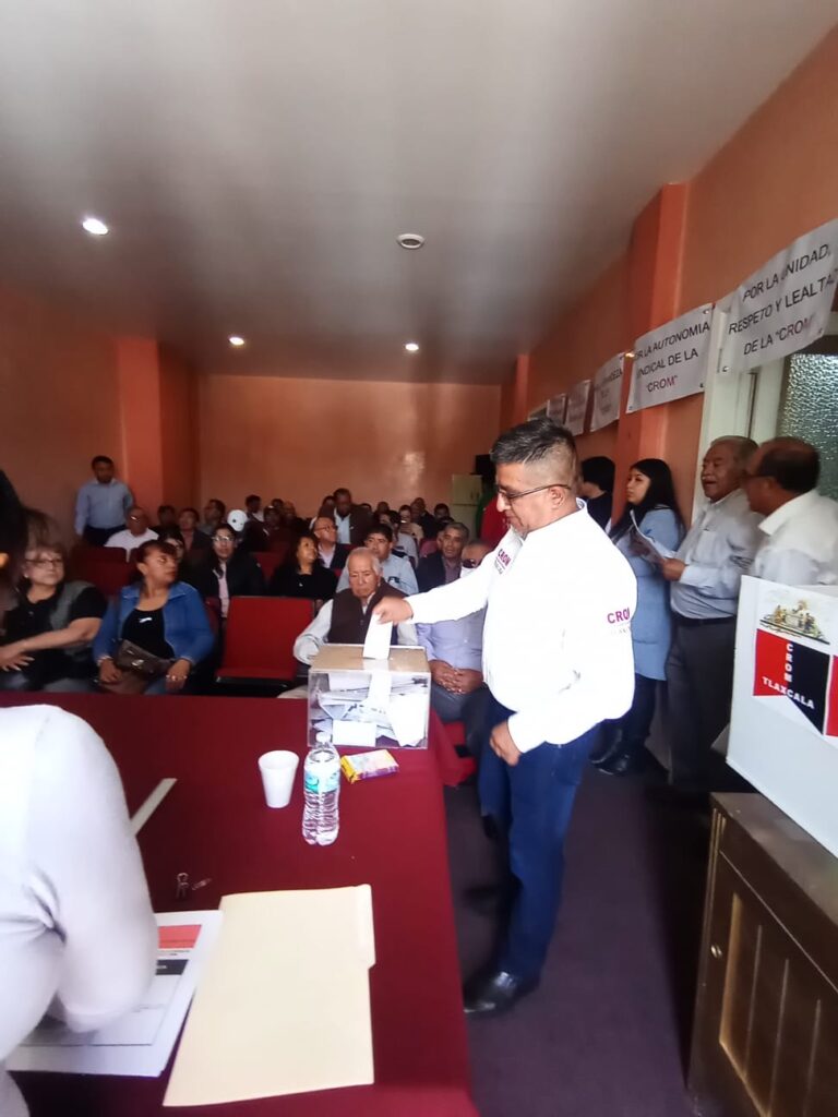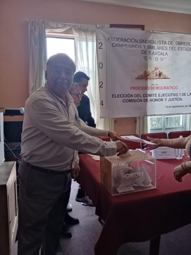 Tlaxcala, Tlax., 14 de septiembre de 2024.- En un proceso democrático a través del voto libre, secreto y directo, representantes de organizaciones sindicales adheridos a la Federación Sindicalista de Obreros, Campesinos y Similares del estado de Tlaxcala CROM, eligieron al nuevo Comité Ejecutivo Estatal encabezado por el Ingeniero Santos Hernández Hernández para el periodo 15 de septiembre de 2024 al 14 de septiembre de 2030.  La nueva dirigencia sindical sustituye al legendario líder estatal Enrique García Peregrina.