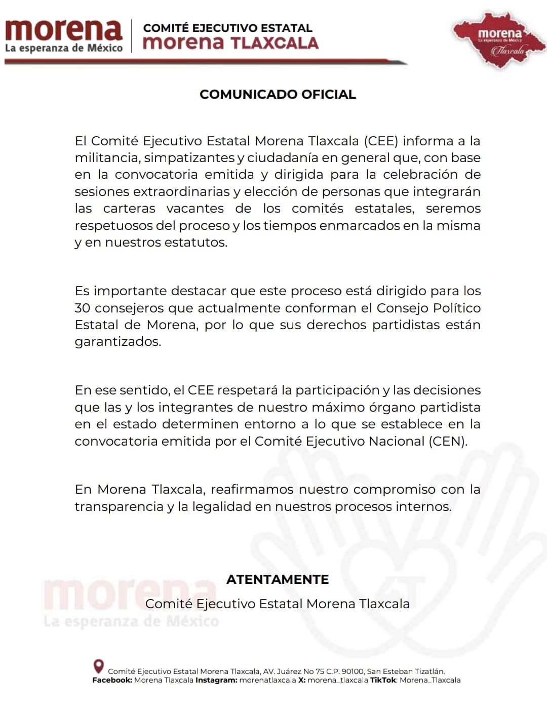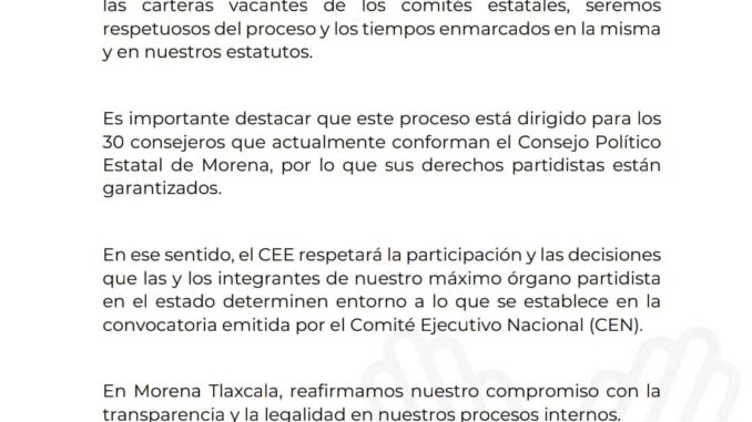 El Comité Ejecutivo Estatal Morena Tlaxcala (CEE) informa a la militancia, simpatizantes y ciudadanía en general que, con base en la convocatoria emitida y dirigida para la celebración de sesiones extraordinarias y elecciones de personas que integrarán las carteras vacantes de los comités estatales, seremos respetuosos del proceso y los tiempos enmarcados en la misma y en nuestros estatutos.