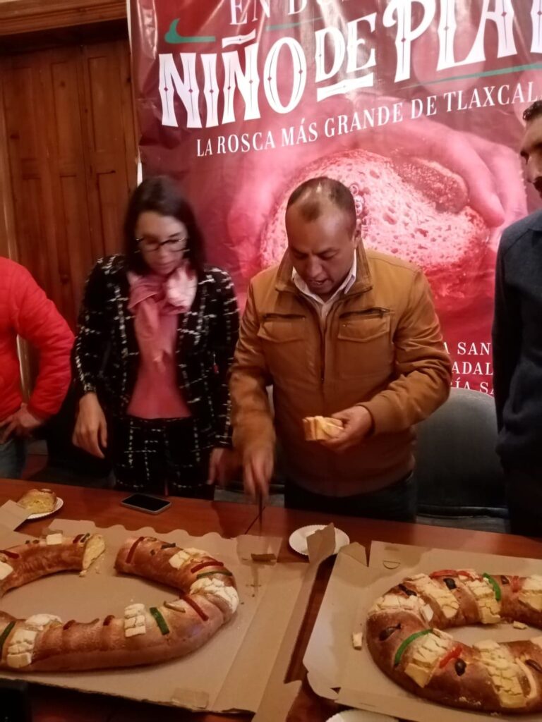 Acompañado de la Secretaría de Turismo Josefina Rodríguez Zamora, agregó que esta rosca tendrán 7 niños de plata, muñocos elaborados por artesanos, así como 25 trompos de madera en miniatura.