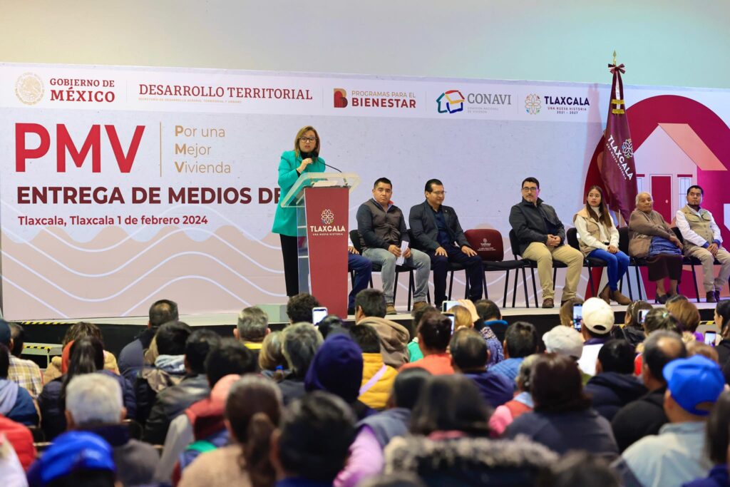 La gobernadora del estado, Lorena Cuéllar Cisneros encabezó la entrega de los medios de pago a los más de 800 beneficiarios del programa Por una Mejor Vivienda (PMV) en el Centro de Convenciones de Tlaxcala, en donde aseguró que este apoyo no solo beneficia a las familias que reciben el recurso, sino a la economía local al adquirir los materiales de construcción necesarios en el estado.