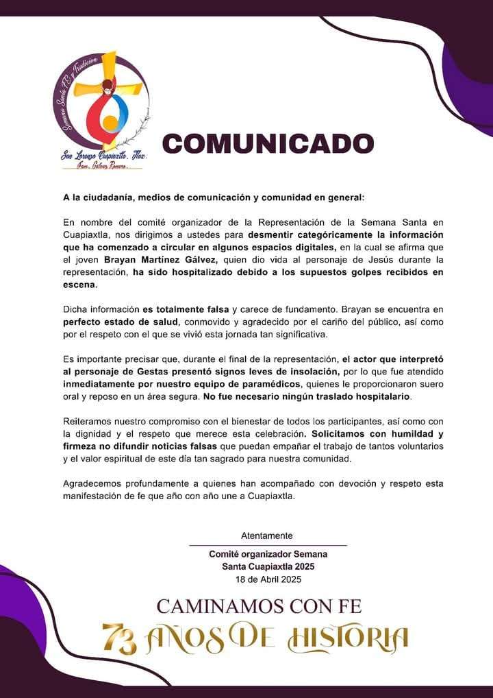 A través de un comunicado, desmienten que el joven Brayan Martínez, quien representó a Cristo el Viernes Santo en Cuapiaxtla, se encuentre hospitalizado.