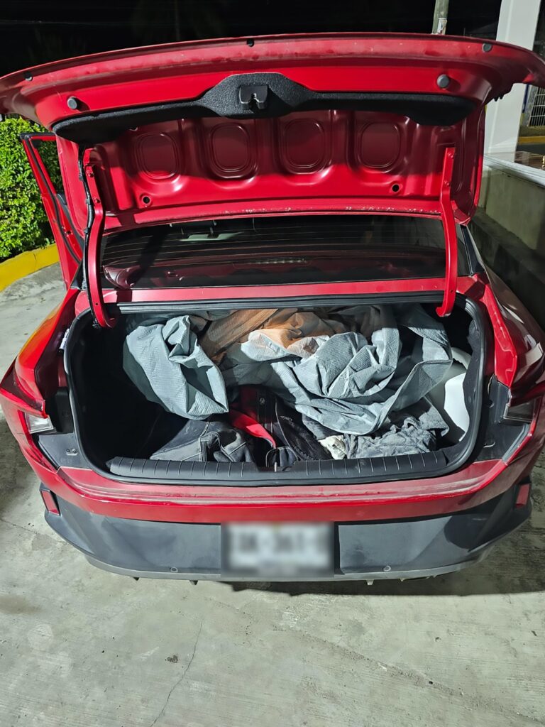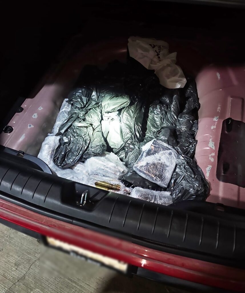 En el lugar de los hechos, los agentes federales realizaron una inspección al automóvil y aseguraron 10 piezas de arma larga que comprende el mecanismo de acción y de disparo; dos piezas de culata de arma larga y además cinco armas largas. También localizaron 399 cartuchos de alto calibre y 13 cargadores.