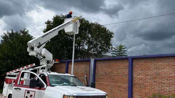 En la comunidad de San Diego Xocoyucan, personal de Servicios Públicos Municipales realizó la reparación de lámparas, colocación de focos inversor de 60W RT, reconexiones y el suministro de líneas de alimentación en el área del preescolar Mariano Matamoros.