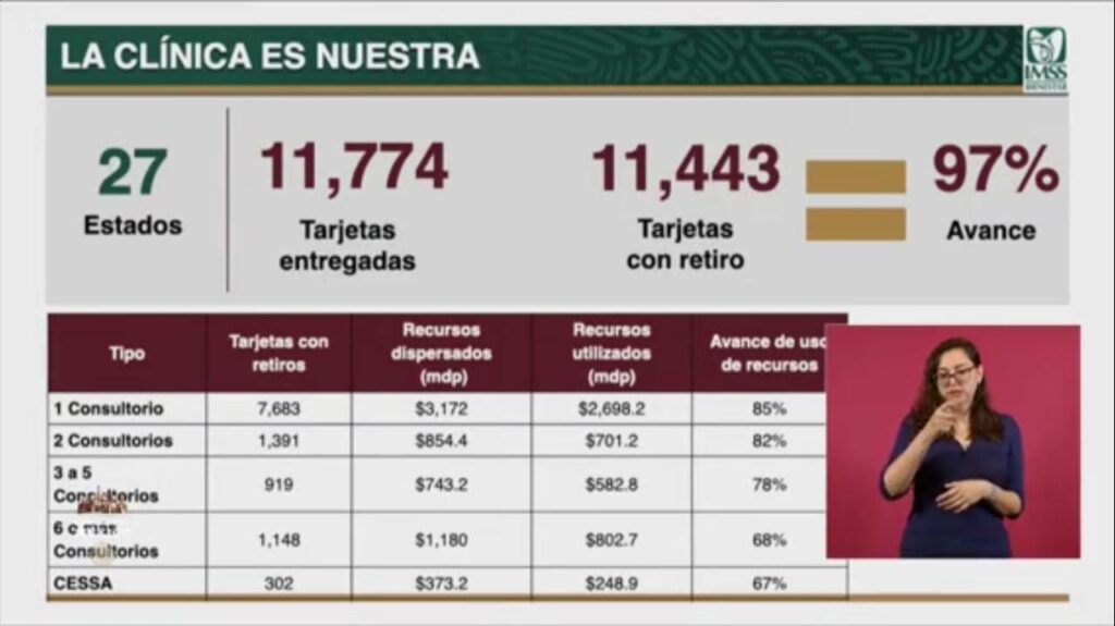 Agregó que, del programa La Clínica es Nuestra, que funciona en 27 estados del país, se han entregado 11 mil 774 tarjetas y que se han dispersado 6 mil 322 millones de pesos, ante lo cual, apuntó que “no hay en la historia del sistema de salud mexicano una inversión tan grande y, sobre todo, tan eficiente a la hora de ponerla en manos de la población, para el ejercicio de los recursos en necesidades de salud”.