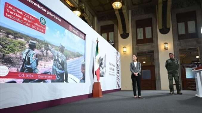 Ciudad de México, 21 de mayo de 2025.- La Presidenta Claudia Sheinbaum Pardo destacó que a siete meses de su gobierno la inversión pública se ha traducido en obras como las nuevas rutas de trenes de pasajeros AIFA-Pachuca, Ciudad de México-Querétaro, así como la vía de carga del Tren Maya, cuya construcción están a cargo del agrupamiento de ingenieros militares “Felipe Ángeles» de la Secretaría de la Defensa Nacional. Mientras que los tramos Querétaro-Irapuato y Saltillo-Nuevo Laredo ya fueron licitados.