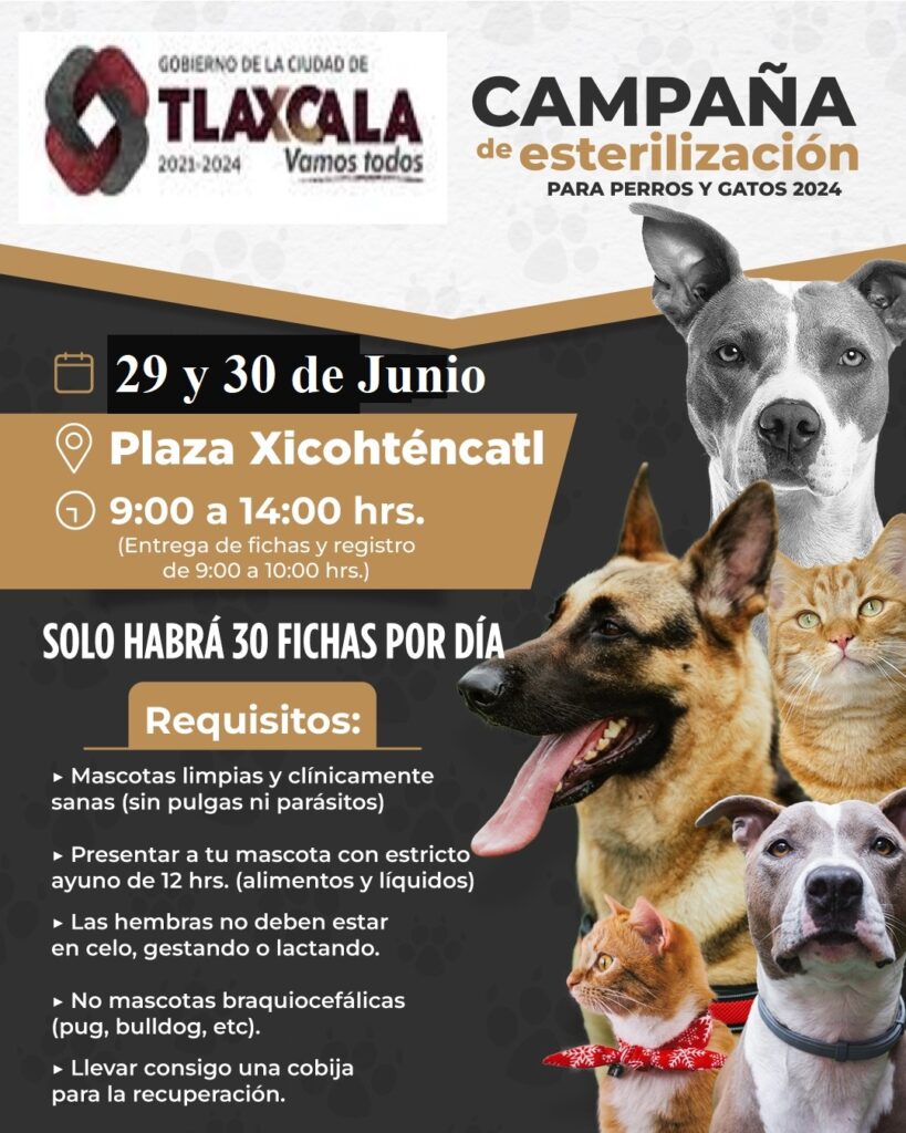 Invita Ayuntamiento Capitalino a campaña de esterilización de perros y gatos junio 28, 2024 Redacción Municipios Para compartir El Ayuntamiento de Tlaxcala te invita a aprovechar esta campaña de esterilización gratuita de perros y gatos, este fin de semana en Tlaxcala Capital. Sábado 29 y domingo 30 de junio en la Plaza Xicohténcatl #VamosTodos #TlaxcalaCapital