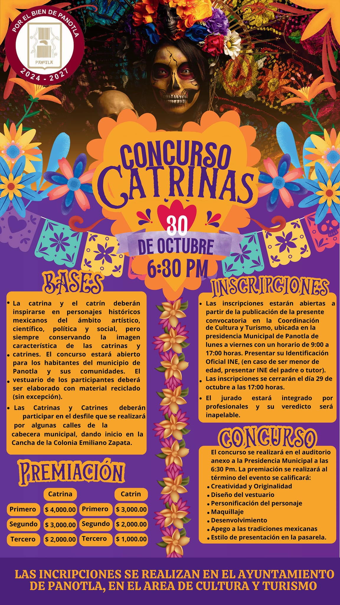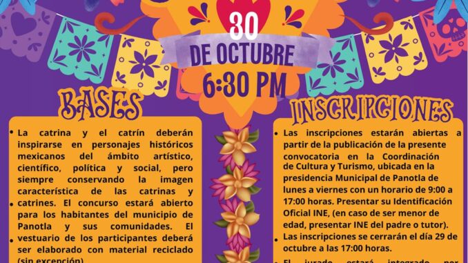 El Ayuntamiento de Panotla a través de la Dirección de Cultura y Turismo invitan al público en general a ser partícipes del Concurso de Catrines y Catrinas, que se llevará a cabo el día 30 de octubre del 2024 en la presidencia municipal.
