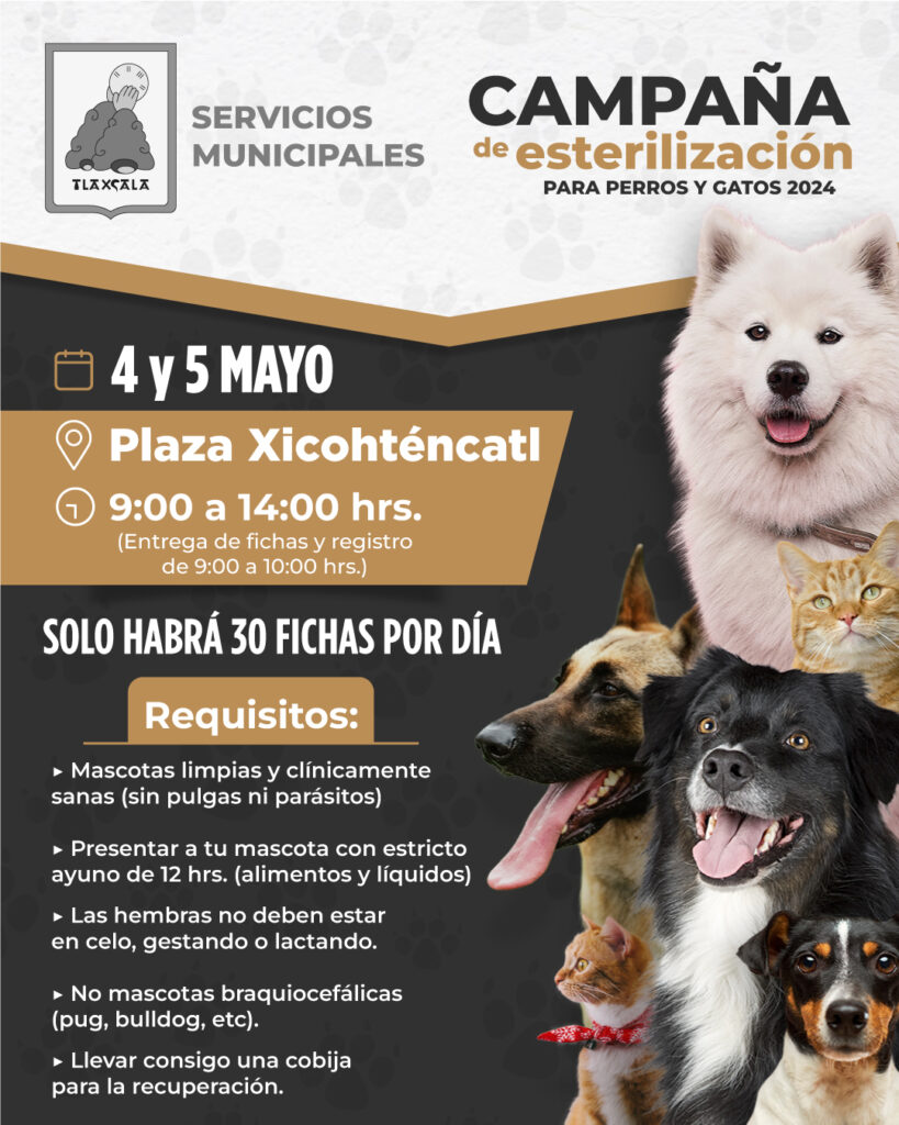 El Ayuntamiento de Tlaxcala, invita a la población en general, a la campaña de esterilización de perros y gatos en la plaza Xicohténcatl este sábado 4 y domingo 5 de mayo