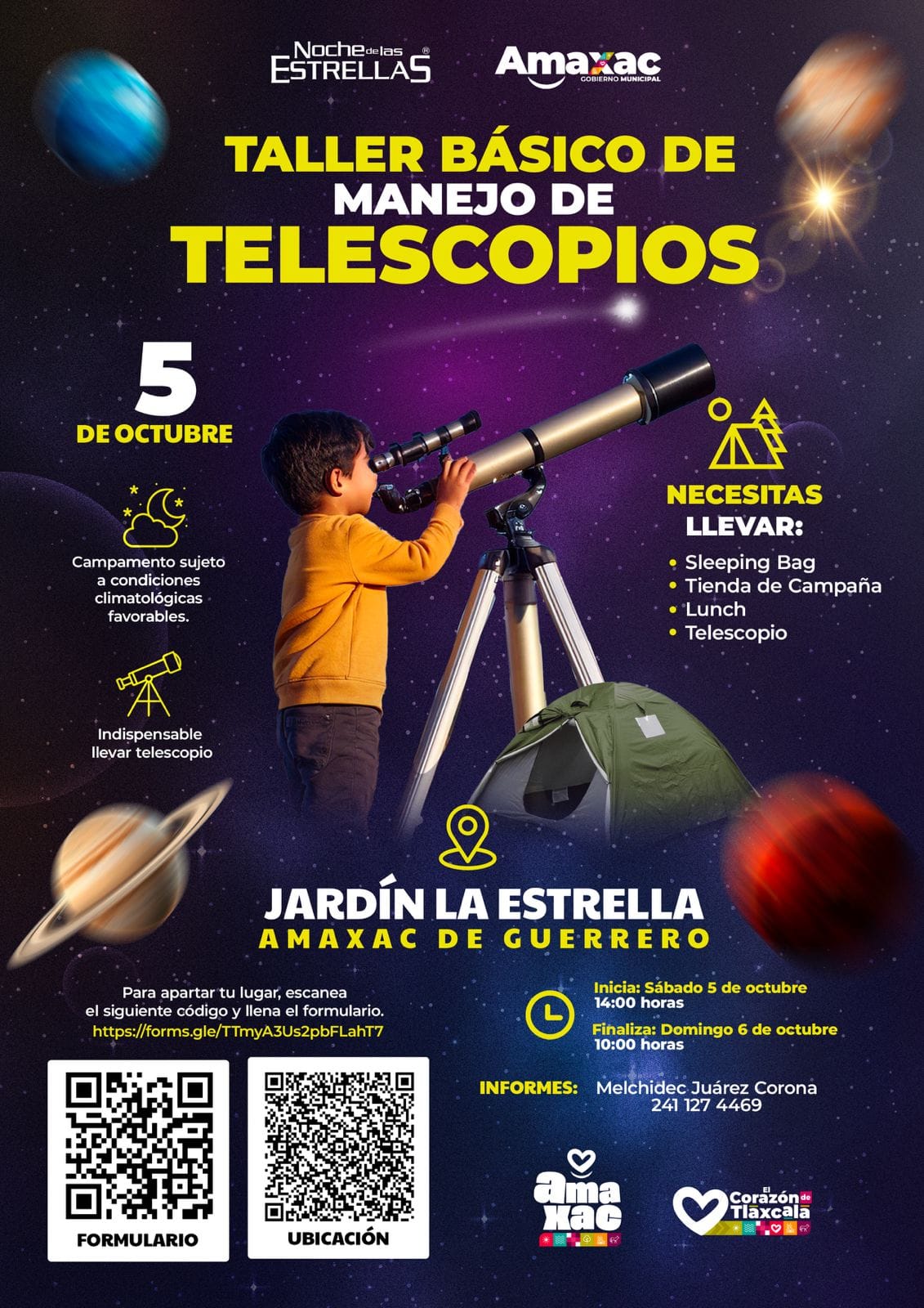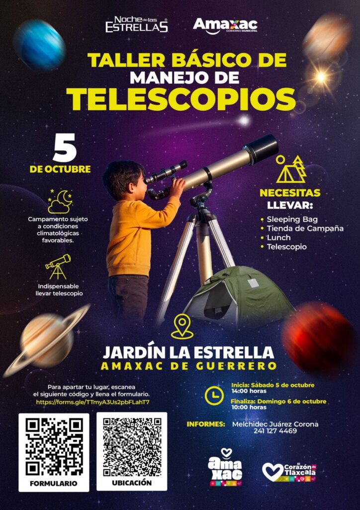 Invita H. Ayuntamiento de Amaxac al taller básico de manejo de telescopio, sábado 5 de octubre. octubre 5, 2024 Redacción Municipios Para compartir Invita H. Ayuntamiento de Amaxac de Guerrero al taller básico de manejo de telescopio, sábado 5 de octubre.