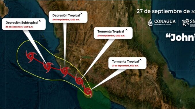 La tormenta tropical John sigue desplazándose de manera lenta y errática frente a