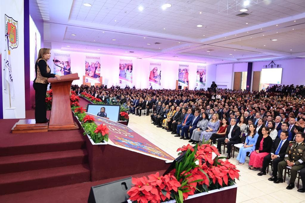 Tlaxcala, Tlax., 08 de diciembre de 2023.- La gobernadora Lorena Cuéllar Cisneros rindió su segundo informe de gobierno, donde presentó los logros y compromisos cumplidos a dos años de arduo trabajo en diferentes rubros como salud, infraestructura, bienestar social, campo, medio ambiente, educación, seguridad y desarrollo económico, entre otros, además de atender problemas sociales que llevaban años sin respuesta. «Nuestro Plan Estatal de Desarrollo contempla cada historia, cada necesidad que me han compartido miles de familias tlaxcaltecas y por eso hoy, entregamos diariamente una calle, una vivienda, un parque, un mercado, una escuela, una clínica o un auditorio, a las comunidades, ya que cerramos las grietas de la corrupción, pues la honestidad transforma vidas», acotó.