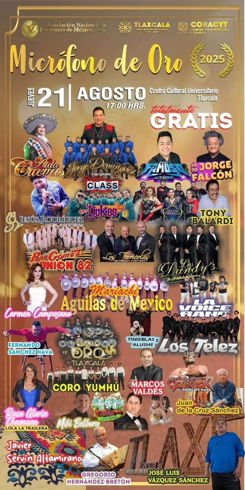 Finalmente, el director Artístico de la Asociación Nacional de Locutores, Armando Hernández Portillo, adelantó que el evento contará con la participación musical de reconocidos artistas como Los Terrícolas, Los Dandy´s, Los Duques en Acción, Humberto Cravioto y su hijo Fernando Cravioto, Jorge Domínguez y su Grupo Super Class, entre otros.