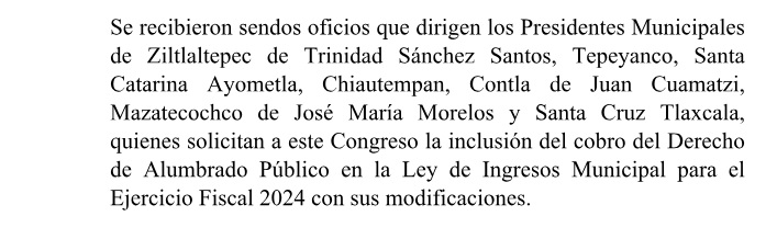 Este es el documento leído en el Poder Legislativo estatal: “Se recibieron sendos oficios que dirigen los presidentes Municipales de Ziltlaltepec de Trinidad Sánchez Santos, Tepeyanco, Santa Catarina Ayometla, Chiautempan, Contla de Juan Cuamatzi, Mazatecochco y Santa Cruz Tlaxcala, solicitaron a la Cámara de Diputados la inclusión del cobro de Derecho de Alumbrado Público en la Ley de Ingresos Municipales para el Ejercicio Fiscal 2024 con sus modificaciones.