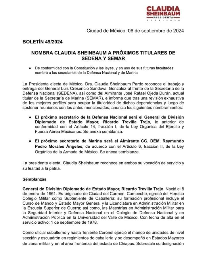 La Presidenta electa de México, Dra. Claudia Sheinbaum Pardo reconoce el trabajo y entrega del General Luis Cresencio Sandoval González al frente de la Secretaría de la Defensa Nacional (SEDENA), así como del Almirante José Rafael Ojeda Durán, actual titular de la Secretaría de Marina (SEMAR), e informa que tras una revisión exhaustiva de los mejores perfiles para ocupar la titularidad de dichas dependencias y luego de sostener reuniones con los antes mencionados, anuncia los siguientes nombramientos: