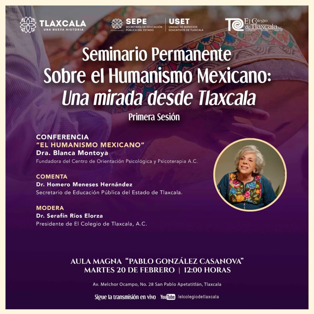 En el marco del Seminario Permanente sobre el Humanismo Mexicano, una mirada desde Tlaxcala, la Dra. Blanca Montoya ofrecerá conferencia este martes 20 de febrero a las 12.00 horas en la aula magna «Pablo González Casanova» del Colegio de Tlaxcala, ubicado en San Pablo Apetatitlán.
