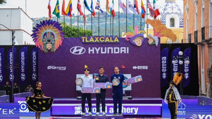La gobernadora Lorena Cuéllar Cisneros y Gabriel Ramos, presidente de World Archery Mexico (Wamex), entregaron a Kim Woojin, de Corea del Sur, el trofeo de la Final de Copa del Mundo de Tiro con Arco Tlaxcala 2024 en la modalidad de arco recurvo varonil.