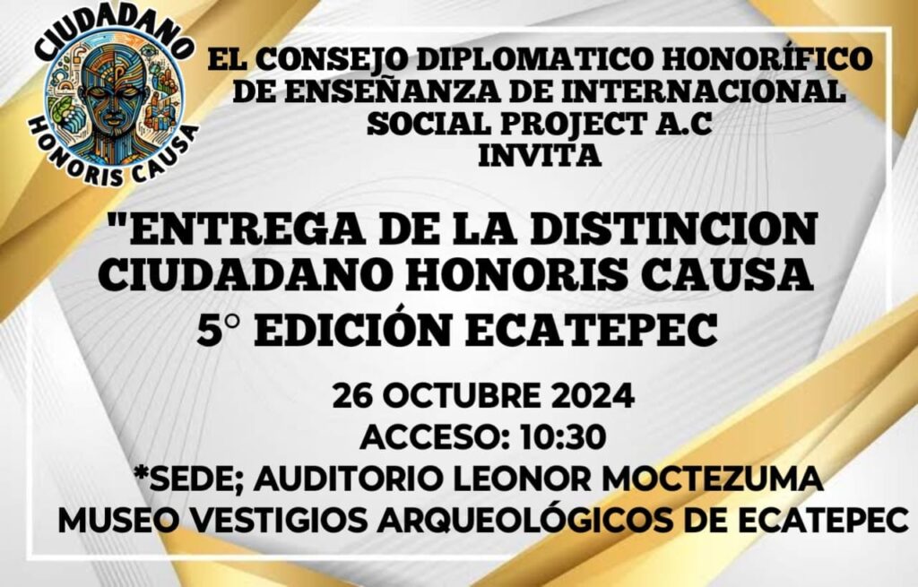 La Asociación Ecológica denominada, «Por Una Causa Verde en Común», participará en la quinta entrega del reconocimiento «Ciudadano Honoris Causa», por parte del Consejo Diplomático Honorífico de Enseñanza de Internacional Social Project, a la trayectoria social en beneficio de sus semejantes y altruismo social.