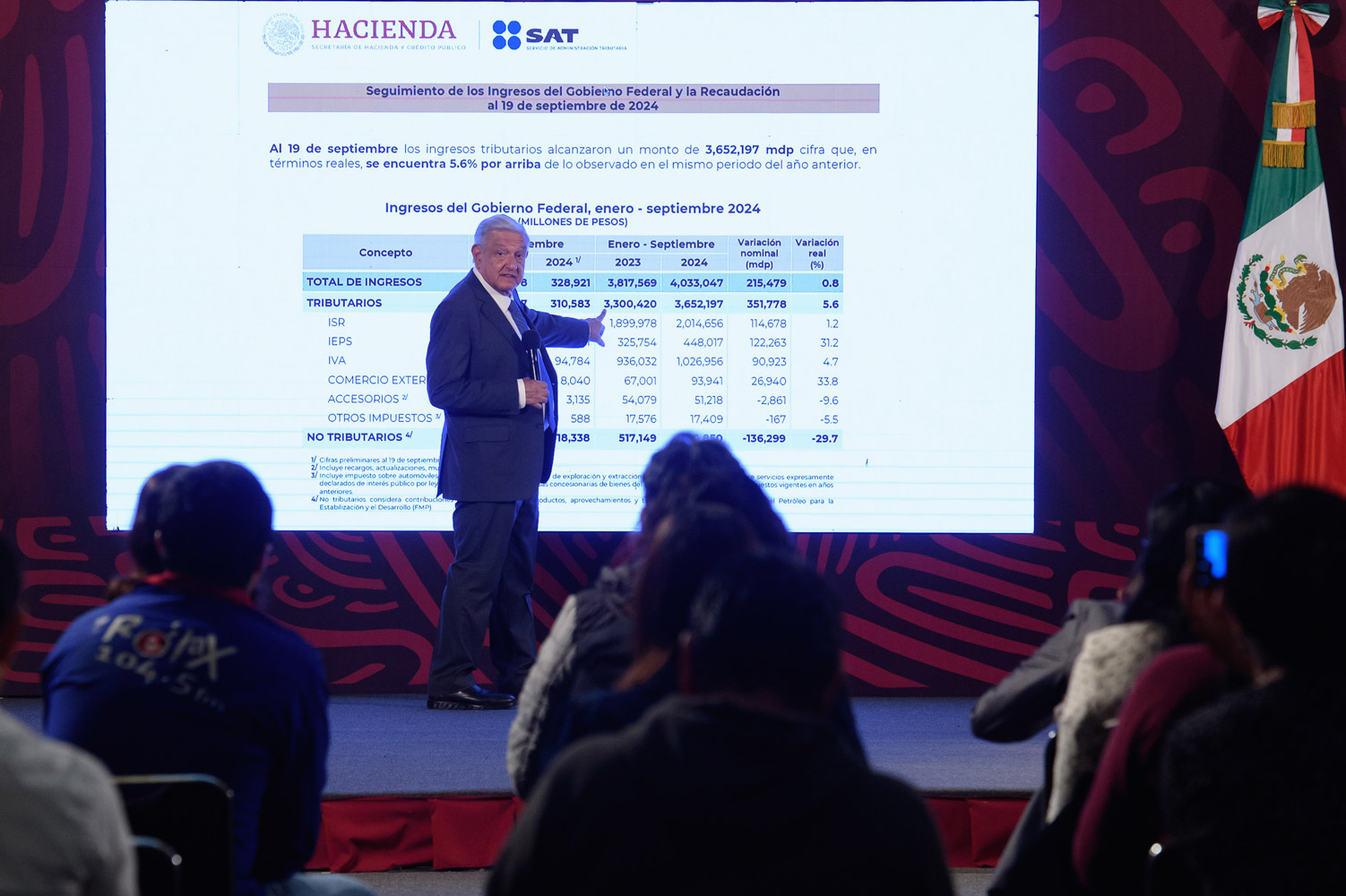 El mandatario refirió que el Gobierno de México, a pesar de la pandemia, ha mantenido una tendencia al alza en la recaudación tributaria entre 2019 y 2024, debido a la cancelación de condonaciones de impuestos luego de la reforma al artículo 28 constitucional.
