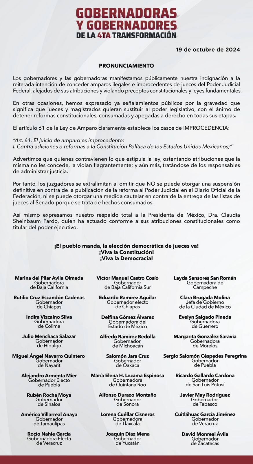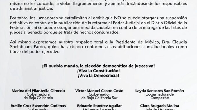 Luego que una juez de Veracruz presentó un amparo y pidió a la presidenta de la República Claudia Sheinbaum Pardo para bajar del Diario Oficial de la Federación la reciente aprobación a la Reforma del Poder Judicial, las gobernadoras y gobernadores de la #CuartaTransformación, manifestamos públicamente nuestro rechazo a la reiterada intención de conceder amparos ilegales e improcedentes de jueces del Poder Judicial Federal. Refrendamos nuestro apoyo a la Presidenta Claudia Sheinbaum Pardo, para continuar con la democratización del Poder Judicial.