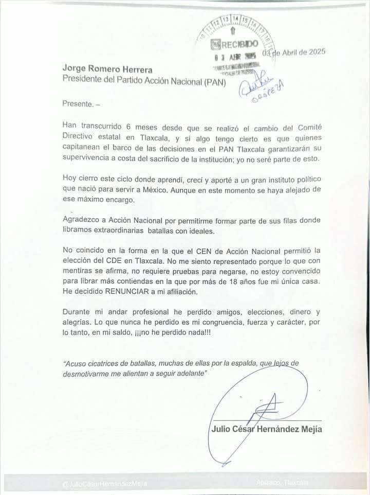 A través de redes sociales, el expresidente municipal de Apizaco Julio César Hernández Mejía, presentó su renuncia al Partido Acción Nacional.
