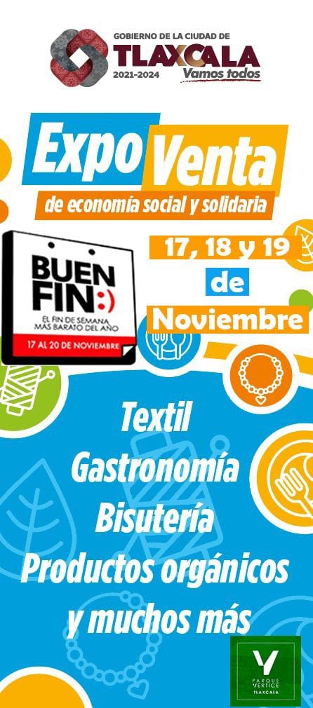 El Ayuntamiento de Tlaxcala se suma a la promoción de la estrategia de «El Buen Fin» y te invita a la expo venta de economía social y solidaria, así como del Bazar Joven, presentes del 17 al 19 de noviembre en Plaza Vértice Tlaxcala.