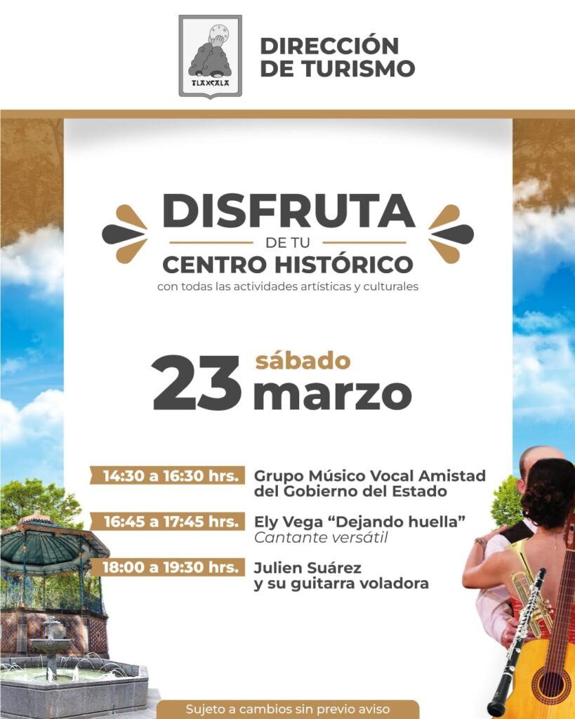 Tlaxcala capital te invita a disfrutar de su centro histórico con las actividades artísticas y culturales. marzo 25, 2024 Redacción Municipios Para compartir Te invitamos a visitar nuestro pabellón artesanal en la Plaza de la Constitución y el mercado de artesanos en la calle Xicohténcatl 11 (parte posterior a la presidencia municipal)