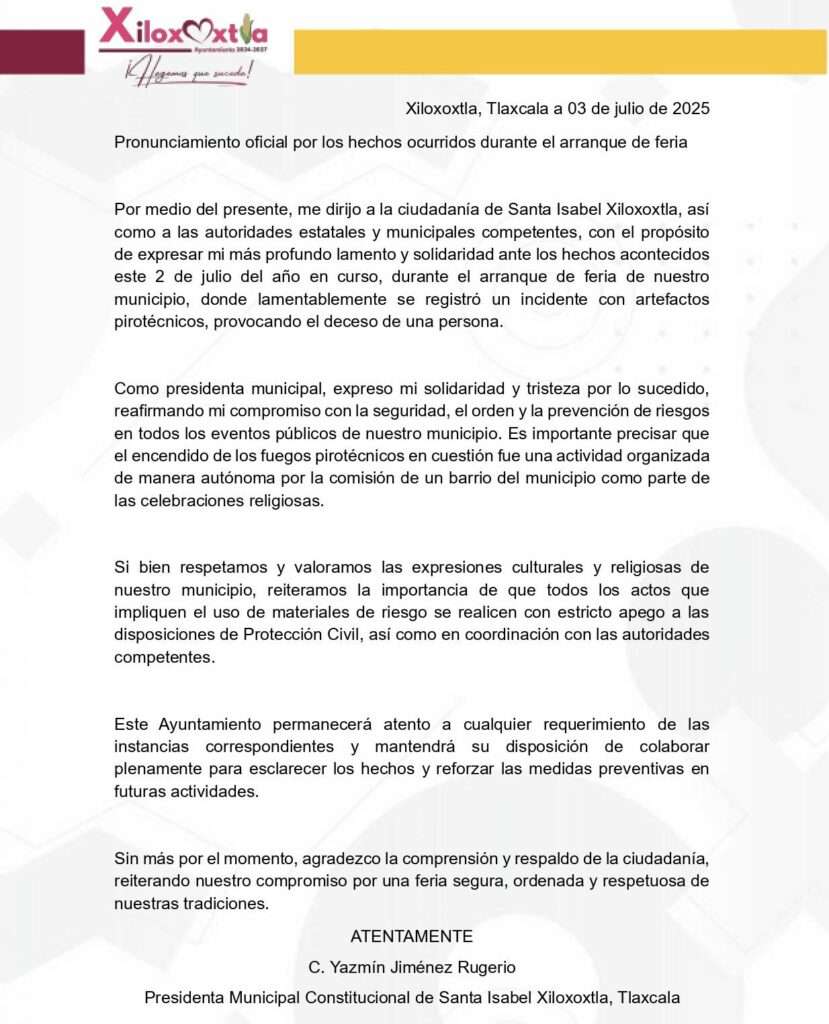 Cabe señalar que el 2 de julio por la noche, durante el arranque de feria se registró una explosión de fuegos pirotécnicos en el municipio de Santa Isabel Xiloxoxtla, en el momento que vecinos del lugar disfrutaban de las actividades patronales, cuando una chispa alcanzó un paquete de productos flamables lo que ocasionó la explosión, dejando como saldo una persona muerta, así como daños materiales en vehículos estacionados en el lugar.