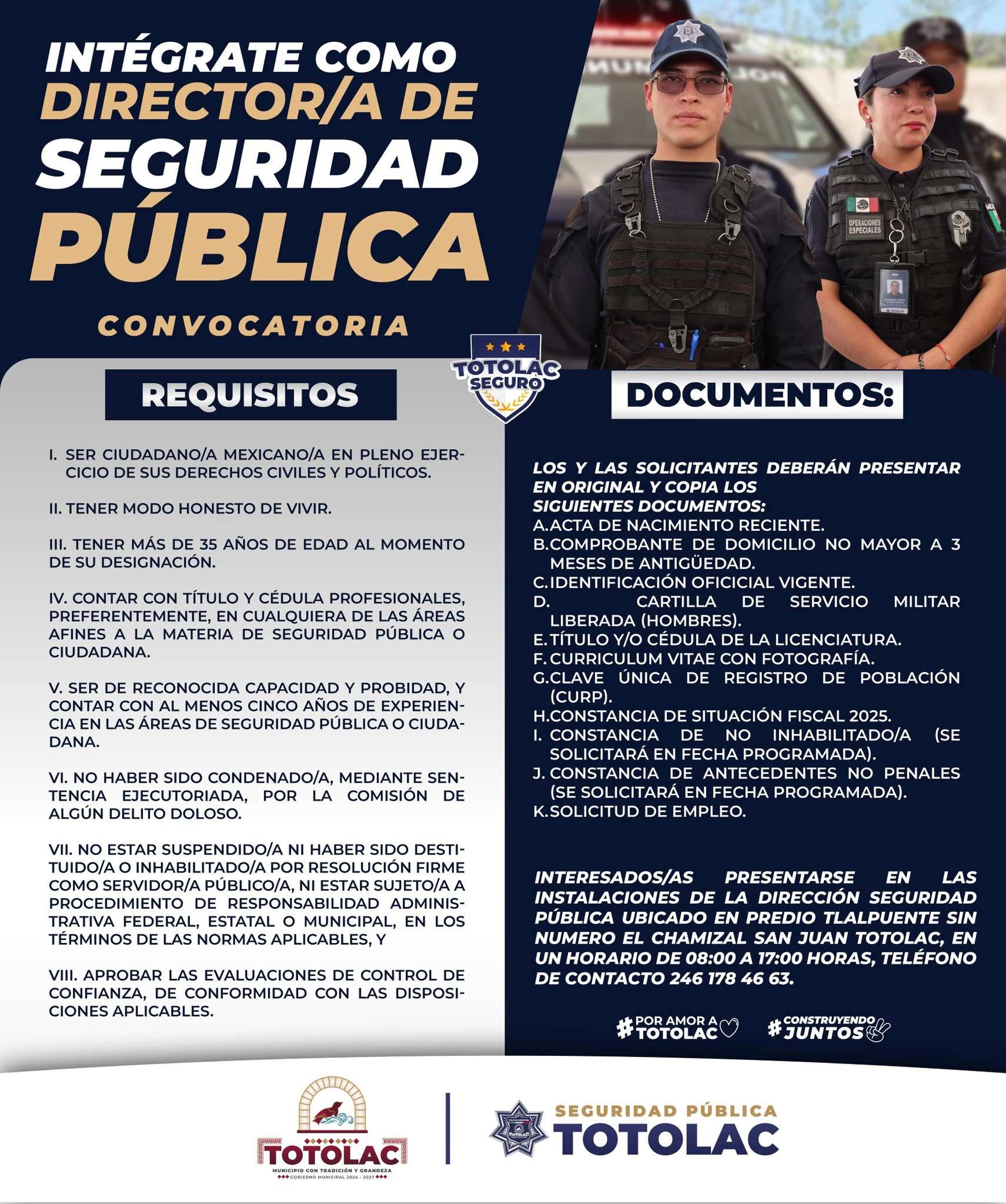 El Gobierno Municipal de Totolac 24-27 convoca a las y los ciudadanos interesados en ocupar un puesto de Directora o Director de Seguridad Pública para formar parte de nuestro equipo de trabajo, con el objetivo de garantizar la seguridad y bienestar de las familias Totolalquenses.